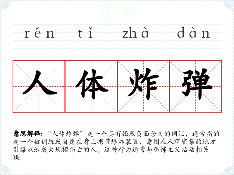 在特定的文化或社会背景中,“人体炸弹”可能与特定的政治冲突或**极端主义相关联。这个词的使用和理解往往受到这些背景因素的影响。