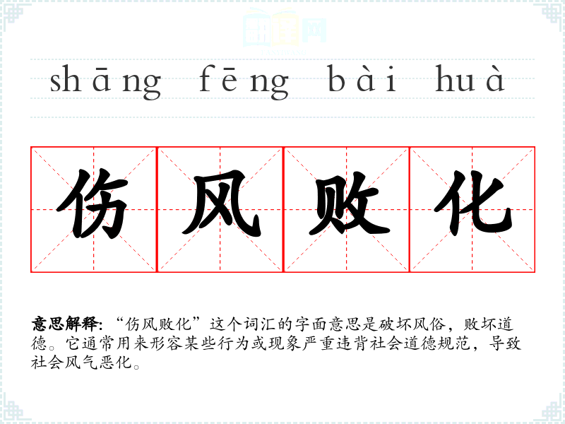 “伤风败化”这个词汇的字面意思是破坏风俗,败坏道德。它通常用来形容某些行为或现象严重违背社会道德规范,导致社会风气恶化。