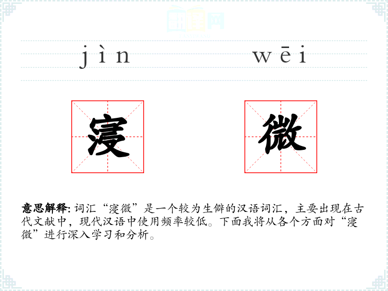 “寖微”的字面意思是逐渐变得微小或不显著。其中,“寖”通“浸”,意为逐渐、渐渐;“微”意为微小、不显著。因此,“寖微”整体上表示某种状态或现象逐渐变得不明显或不重要。