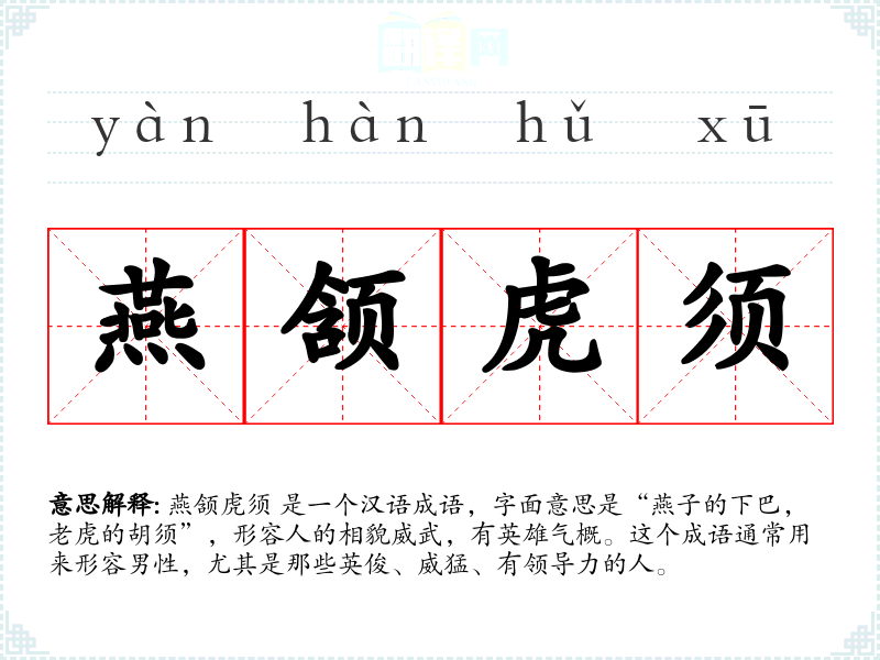 燕颔虎须 是一个汉语成语,字面意思是“燕子的下巴,**的胡须”,形容人的相貌威武,有英雄气概。这个成语通常用来形容男性,尤其是那些英俊、威猛、有领导力的人。