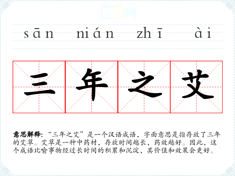 “三年之艾”是一个汉语成语,字面意思是指存放了三年的艾草。艾草是一种中药材,存放时间越长,药效越好。因此,这个成语比喻事物经过长时间的积累和沉淀,其价值和效果会更好。