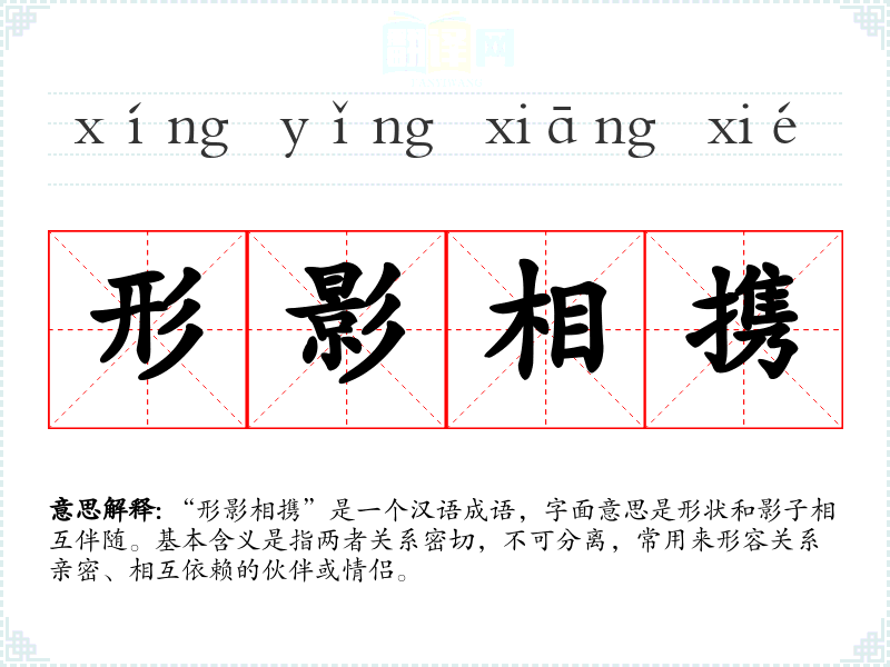 “形影相携”是一个汉语成语,字面意思是形状和影子相互伴随。基本含义是指两者关系密切,不可分离,常用来形容关系亲密、相互依赖的伙伴或情侣。