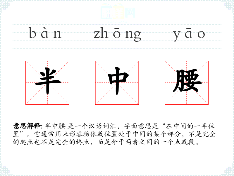 半中腰 是一个汉语词汇,字面意思是“在中间的一半位置”。它通常用来形容物体或位置处于中间的某个部分,不是完全的起点也不是完全的终点,而是介于两者之间的一个点或段。