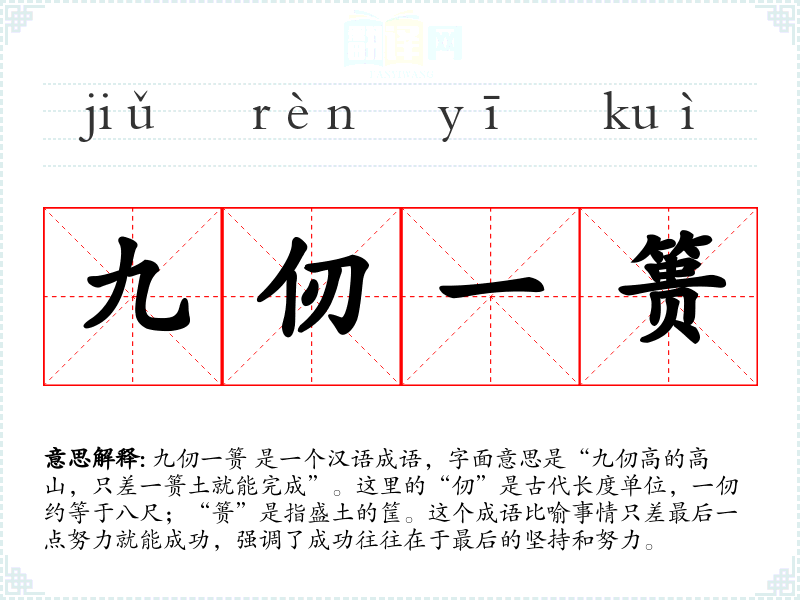 九仞一篑 是一个汉语成语,字面意思是“九仞高的高山,只差一篑土就能完成”。这里的“仞”是古代长度单位,一仞约等于八尺;“篑”是指盛土的筐。这个成语比喻事情只差最后一点努力就能成功,强调了成功往往在于最后的坚持和努力。