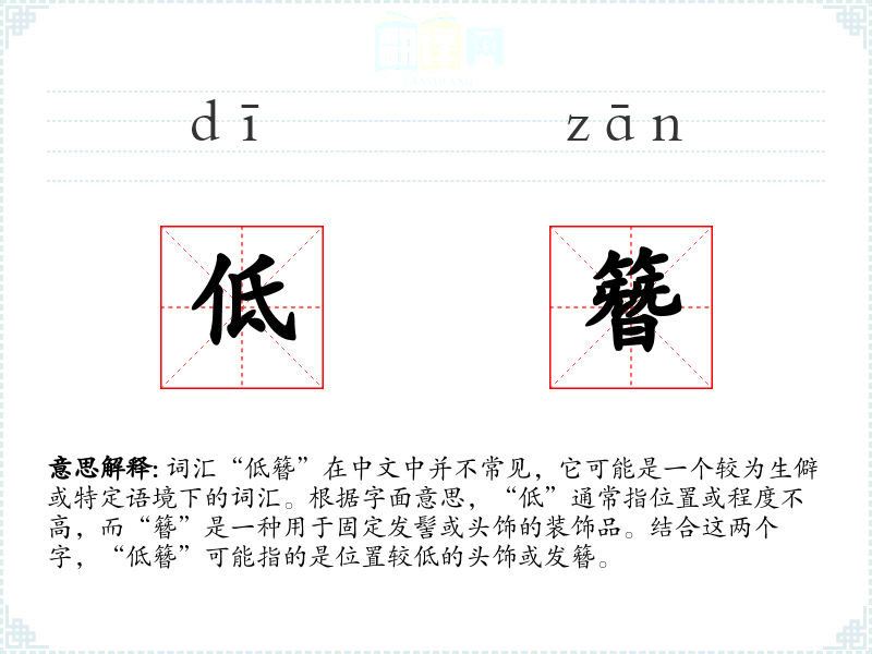 词汇“低簪”在中文中并不常见,它可能是一个较为生僻或特定语境下的词汇。根据字面意思,“低”通常指位置或程度不高,而“簪”是一种用于固定发髻或头饰的装饰品。结合这两个字,“低簪”可能指的是位置较低的头饰或发簪。