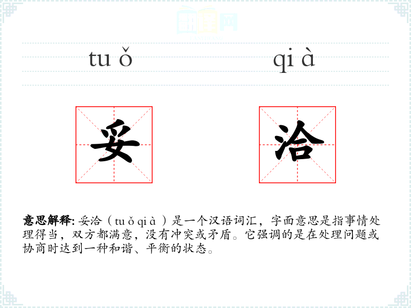 妥洽(tuǒqià)是一个汉语词汇,字面意思是指事情处理得当,双方都满意,没有冲突或矛盾。它强调的是在处理问题或协商时达到一种和谐、平衡的状态。