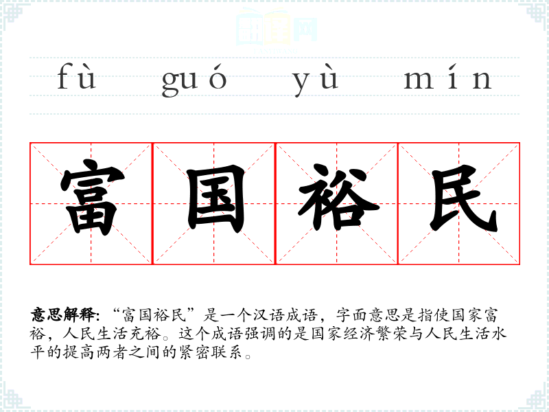 “富国裕民”是一个汉语成语,字面意思是指使国家富裕,人民生活充裕。这个成语强调的是国家经济繁荣与人民生活水平的提高两者之间的紧密联系。