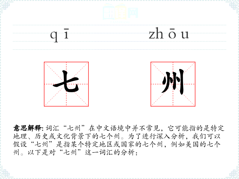 词汇“七州”在中文语境中并不常见,它可能指的是特定地理、历史或文化背景下的七个州。为了进行深入分析,我们可以假设“七州”是指某个特定地区或国家的七个州,例如美国的七个州。以下是对“七州”这一词汇的分析: