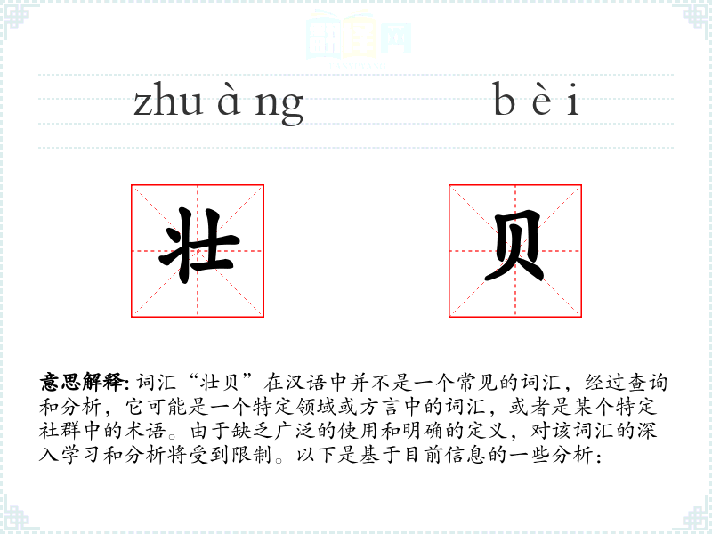 由于“壮贝”不是一个标准汉语词汇,我们无法提供一个确切的基本定义。它可能是某个地方方言中的词汇,或者是某个特定行业或社群中的术语。