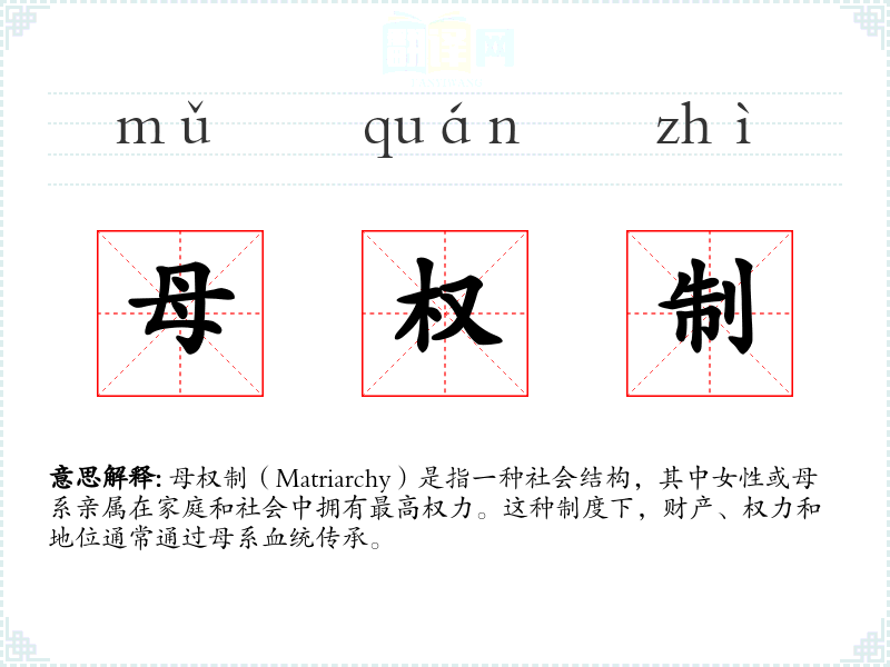 - 反义词:父权制(Patriarchy),指男性在家庭和社会中拥有最高权力的社会结构。