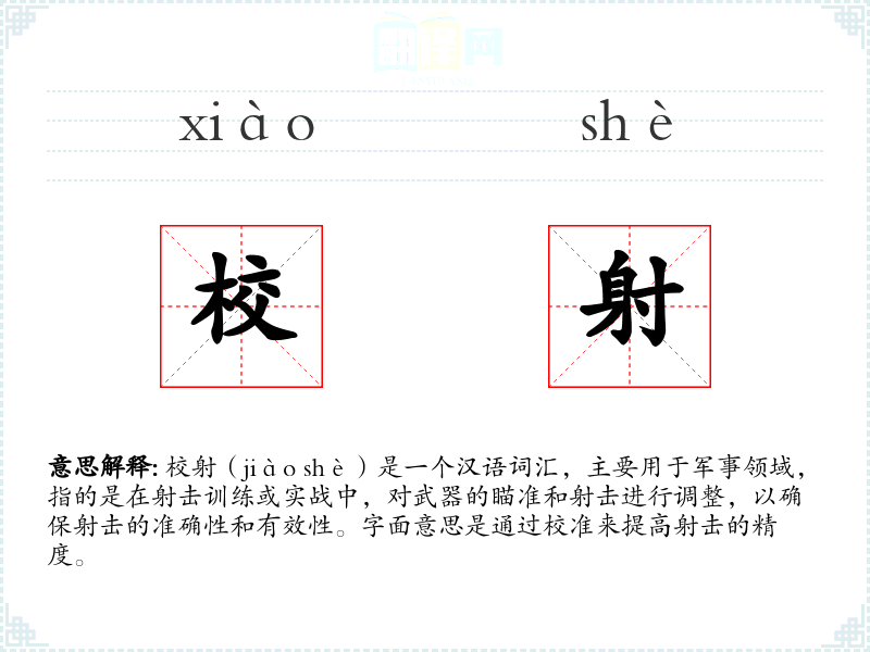 校射(jiào shè)是一个汉语词汇,主要用于军事领域,指的是在射击训练或实战中,对武器的瞄准和射击进行调整,以确保射击的准确性和有效性。字面意思是通过校准来提高射击的精度。