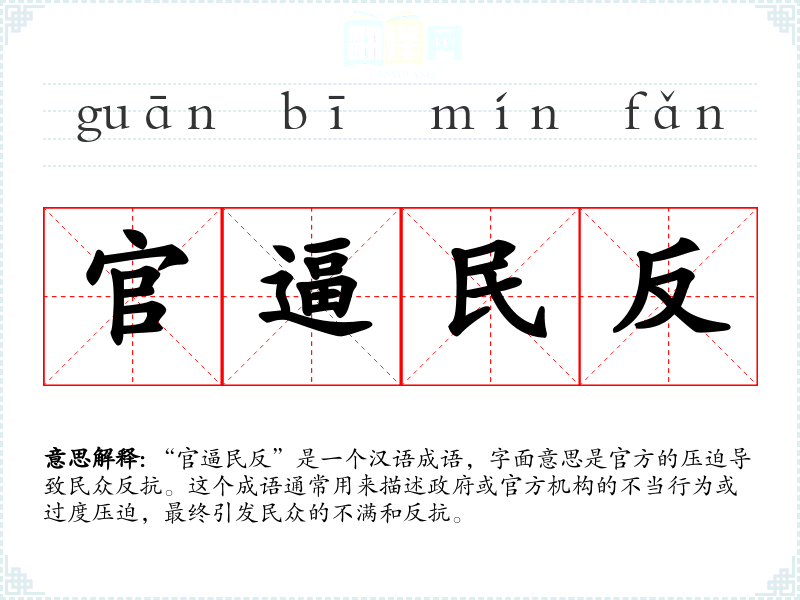 “官逼民反”是一个汉语成语,字面意思是官方的压迫导致民众反抗。这个成语通常用来描述政府或官方机构的不当行为或过度压迫,最终引发民众的不满和反抗。
