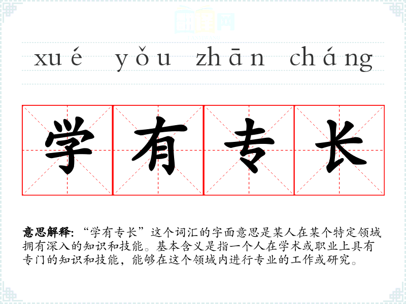“学有专长”这个词汇的字面意思是某人在某个特定领域拥有深入的知识和技能。基本含义是指一个人在学术或职业上具有专门的知识和技能,能够在这个领域内进行专业的工作或研究。