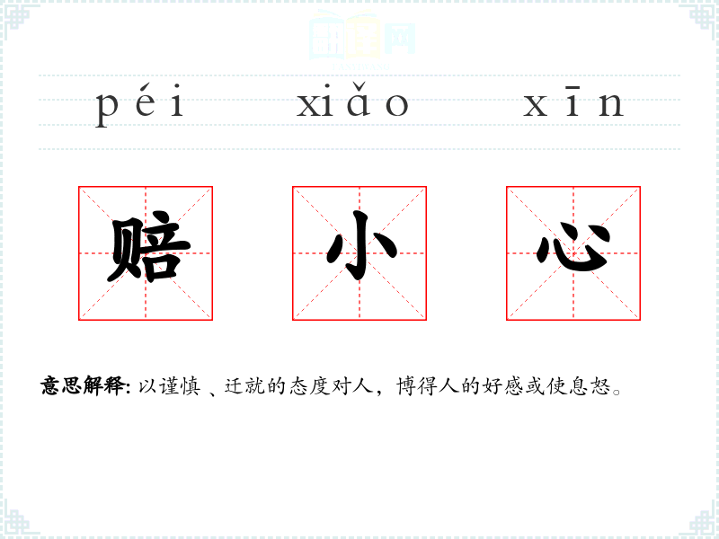 以谨慎﹑迁就的态度对人,博得人的好感或使息怒。