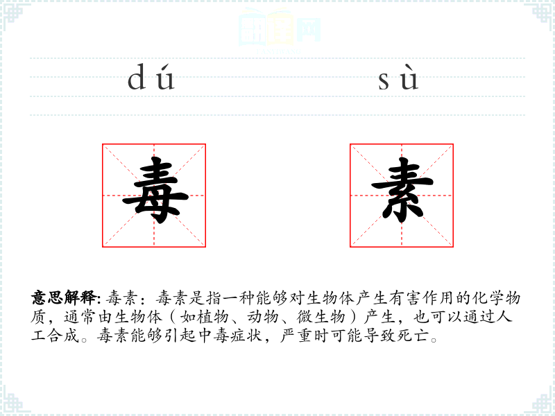 - 理解:毒素是一个涉及生物学、医学、环境科学等多个领域的复杂概念,其含义和应用范围广泛。
