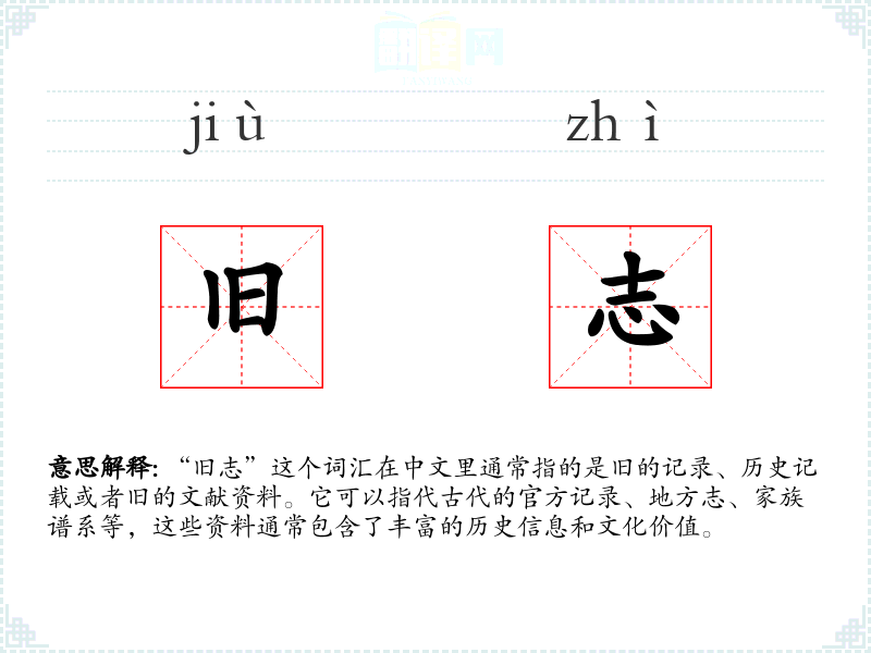 “旧志”一词由“旧”和“志”两个字组成。“旧”字意为古老、陈旧,“志”字在这里指的是记录、记载。这个词在古代文献中较为常见,随着时间的推移,其含义和用法基本保持稳定。