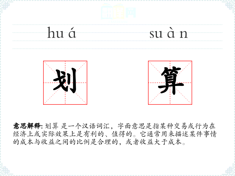 划算 是一个汉语词汇,字面意思是指某种交易或行为在经济上或实际效果上是有利的、值得的。它通常用来描述某件事情的成本与收益之间的比例是合理的,或者收益大于成本。