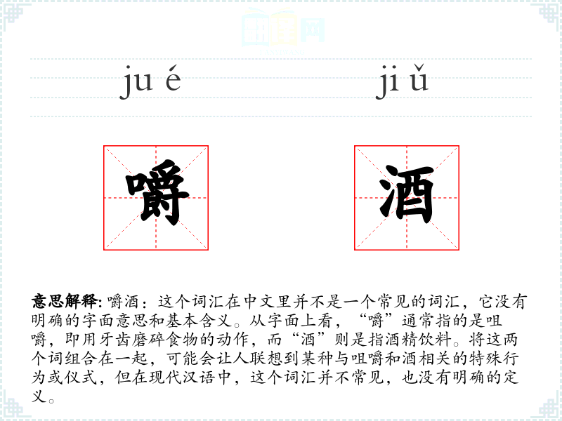 嚼酒:这个词汇在中文里并不是一个常见的词汇,它没有明确的字面意思和基本含义。从字面上看,“嚼”通常指的是咀嚼,即用牙齿磨碎食物的动作,而“酒”则是指酒精饮料。将这两个词组合在一起,可能会让人联想到某种与咀嚼和酒相关的特殊行为或仪式,但在现代汉语中,这个词汇并不常见,也没有明确的定义。