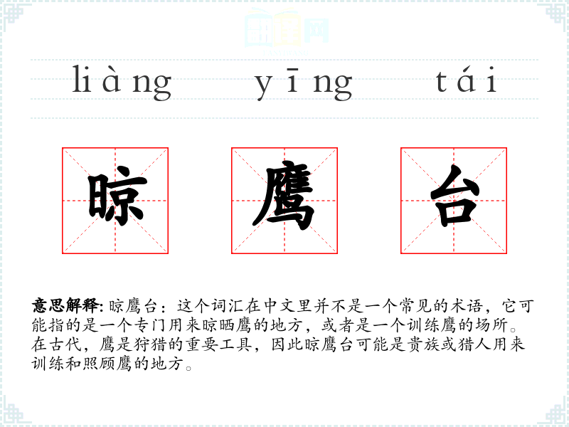 晾鹰台:这个词汇在中文里并不是一个常见的术语,它可能指的是一个专门用来晾晒鹰的地方,或者是一个训练鹰的场所。在古代,鹰是狩猎的重要工具,因此晾鹰台可能是贵族或猎人用来训练和照顾鹰的地方。