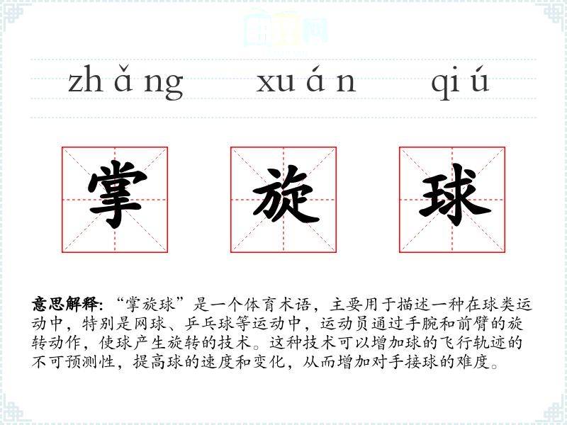 “掌旋球”这个词汇源于体育技术术语,随着体育**的发展,这个词汇逐渐被广泛接受和使用。它的构成体现了对技术动作的描述,其中“掌”指的是手掌和手腕的动作,“旋”表示旋转的动作。