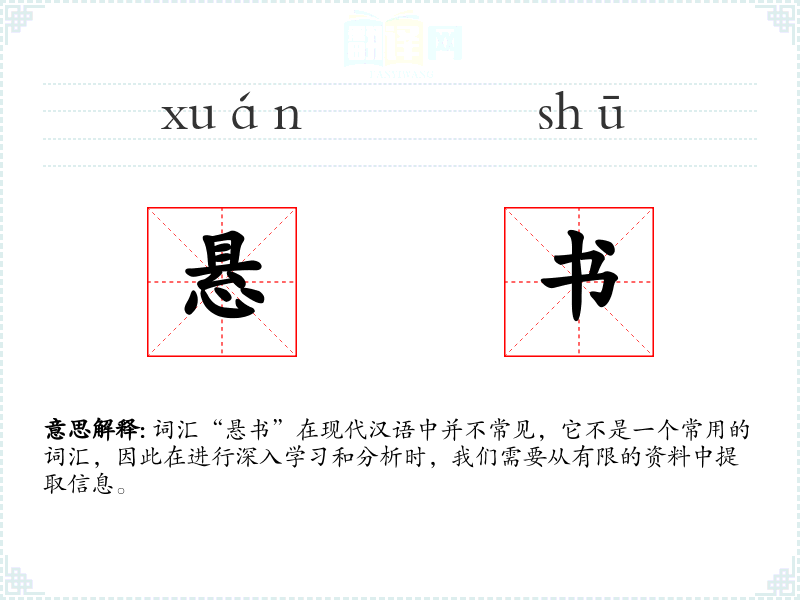由于“悬书”不是一个常用词汇,它在现代文学、口语或专业领域中的使用非常有限。在古代文献中,悬书可能与教育、学术或**活动有关,但在现代语境中,这个词汇几乎不被使用。