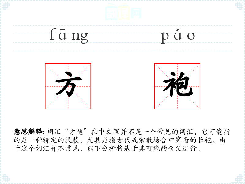 词汇“方袍”在中文里并不是一个常见的词汇,它可能指的是一种特定的服装,尤其是指古代或**场合中穿着的长袍。由于这个词汇并不常见,以下分析将基于其可能的含义进行。