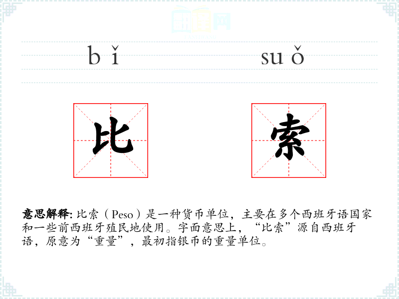 比索(Peso)是一种货币单位,主要在多个西班牙语国家和一些前西班牙殖民地使用。字面意思上,“比索”源自西班牙语,原意为“重量”,最初指银币的重量单位。