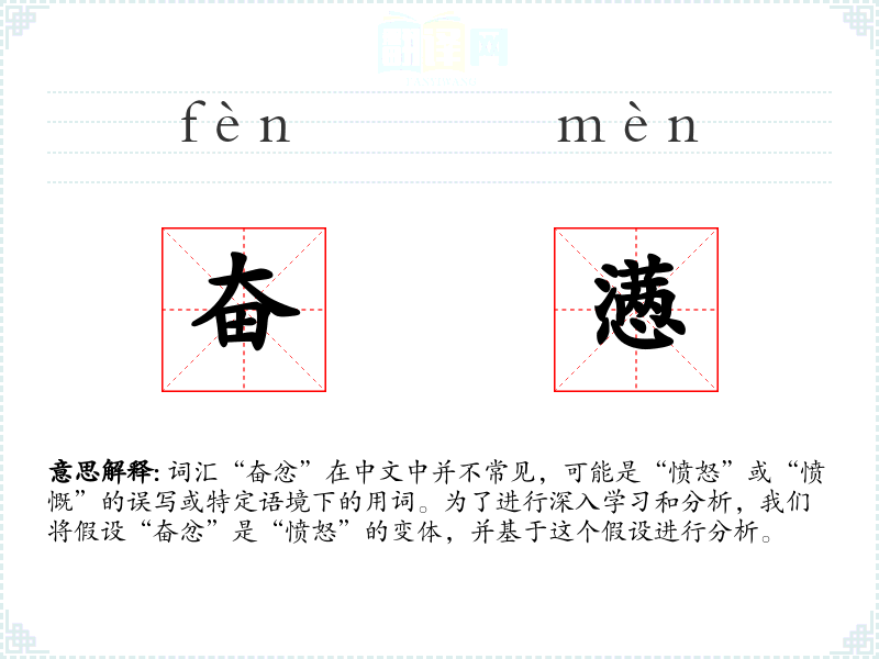 词汇“奋忿”在中文中并不常见,可能是“愤怒”或“愤慨”的误写或特定语境下的用词。为了进行深入学*和分析,我们将假设“奋忿”是“愤怒”的变体,并基于这个假设进行分析。
