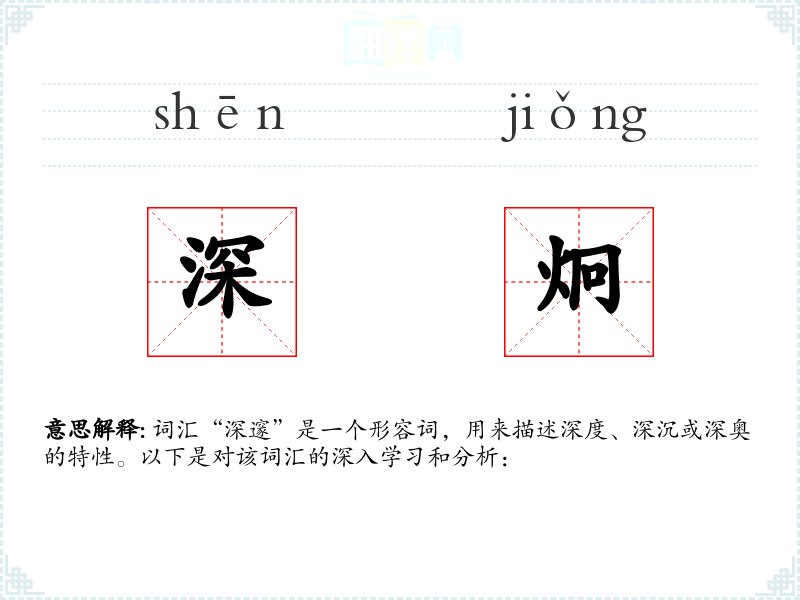 词汇“深邃”是一个形容词,用来描述深度、深沉或深奥的特性。以下是对该词汇的深入学*和分析: