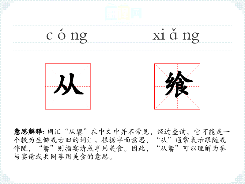 - 词源:“从”和“饗”都是古代汉语词汇,组合在一起形成了一个较为文雅的表达方式。