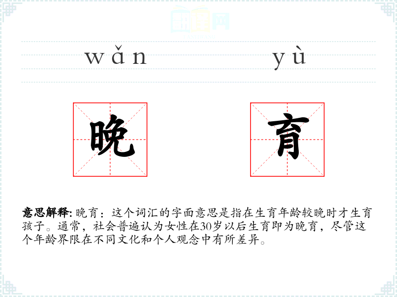 晚育:这个词汇的字面意思是指在生育年龄较晚时才生育孩子。通常,社会普遍认为女性在30岁以后生育即为晚育,尽管这个年龄界限在不同文化和个人观念中有所差异。