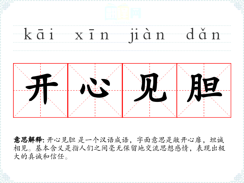 开心见胆 是一个汉语成语,字面意思是敞开心扉,坦诚相见。基本含义是指人们之间毫无保留地交流思想感情,表现出极大的真诚和信任。