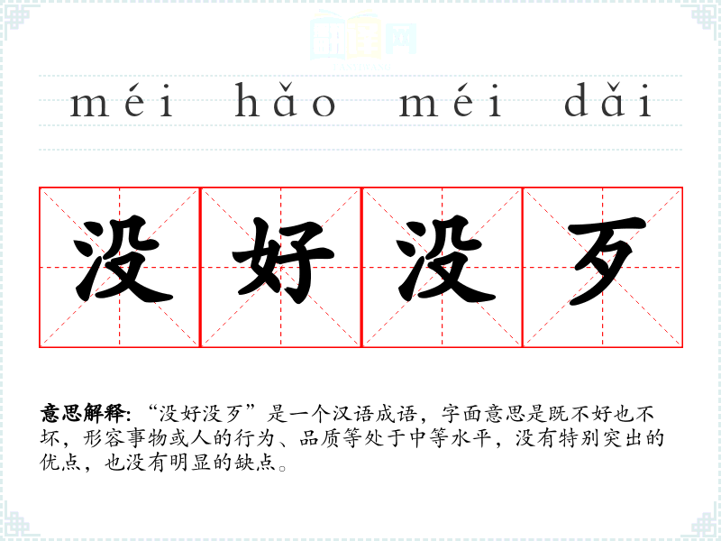 “没好没歹”是一个汉语成语,字面意思是既不好也不坏,形容事物或人的行为、品质等处于中等水平,没有特别突出的优点,也没有明显的缺点。