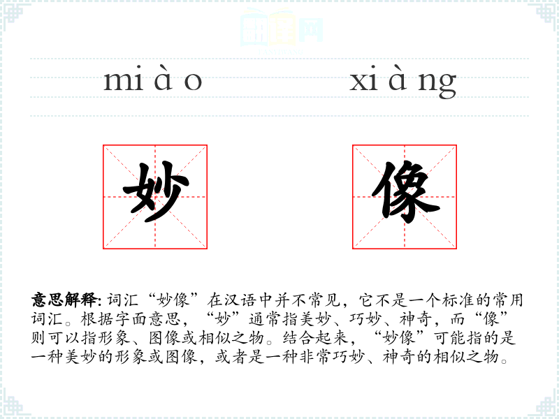 - 由于“妙像”不是一个常用词汇,其词源和演变不太明确。可能是由“妙”和“像”两个常用词汇组合而成,用于特定语境中表达特定的美妙或神奇之意。