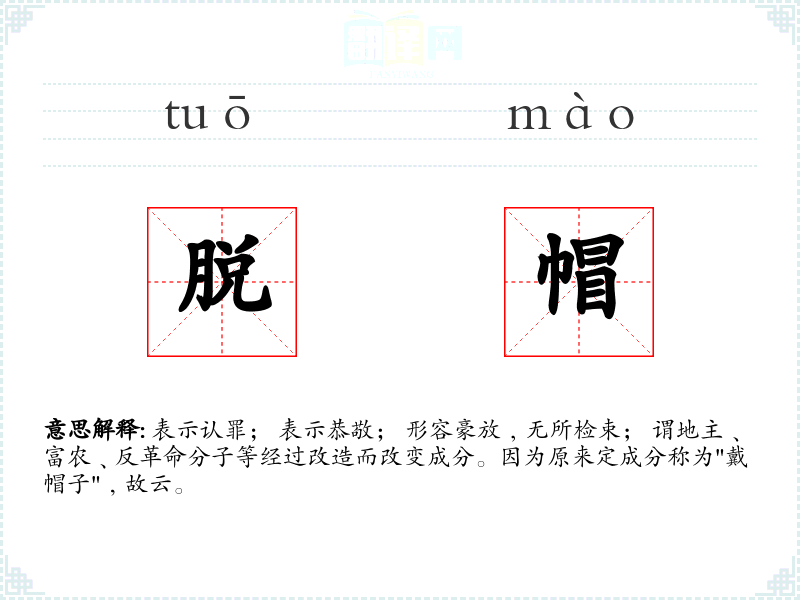 表示认罪; 表示恭敬; 形容豪放﹐无所检束; 谓地主﹑富农﹑反革命分子等经过改造而改变成分。因为原来定成分称为"戴帽子"﹐故云。