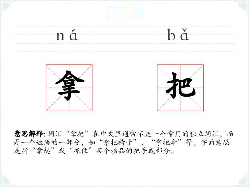 词汇“拿把”在中文里通常不是一个常用的独立词汇,而是一个短语的一部分,如“拿把椅子”、“拿把伞”等。字面意思是指“拿起”或“抓住”某个物品的把手或部分。
