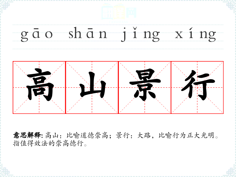 高山:比喻道德崇高;景行:大路,比喻行为正大光明。指值得效法的崇高德行。