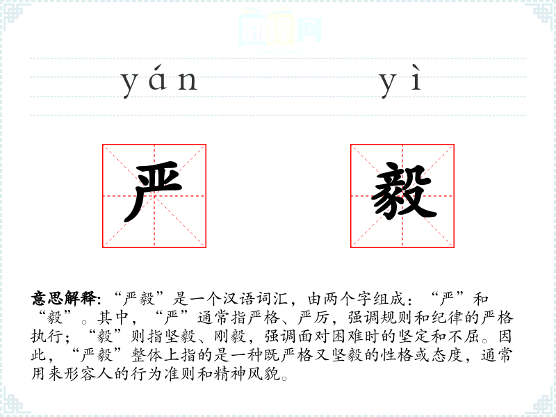 “严”字最早见于甲骨文,原意为高大、庄严,后引申为严格、严厉。“毅”字则源于古代汉语,原意为坚定、不动摇,后引申为坚毅、刚毅。两个字组合成“严毅”,强调了严格与坚毅的结合,这种组合在古代文献中较为常见,如《左传》等。