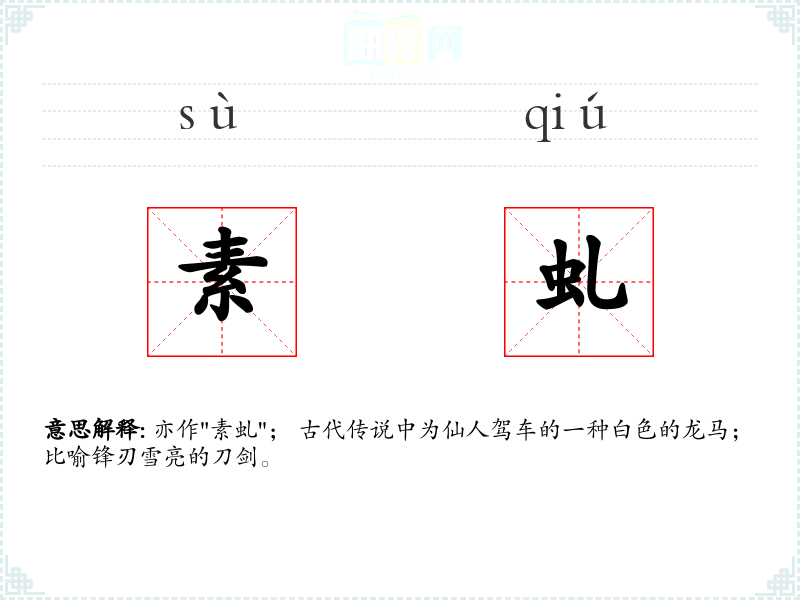 亦作"素虬"; 古代传说中为仙人驾车的一种白色的龙马; 比喻锋刃雪亮的刀剑。
