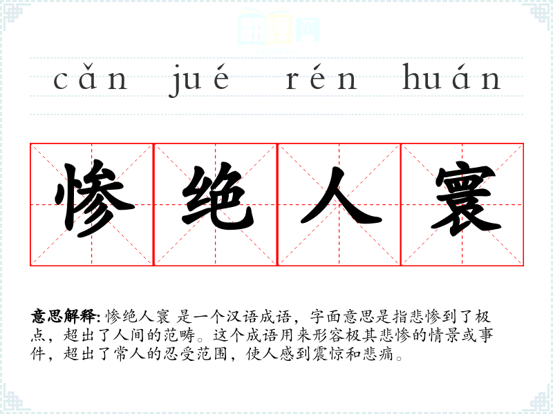 在文化中,惨绝人寰 这个成语常用于描述那些超出常人忍受范围的悲惨,反映了人对于悲惨的深刻同情和对于和平生活的向往。在社会背景中,这个成语常用于警示人们珍惜和平,避免悲剧的重演。