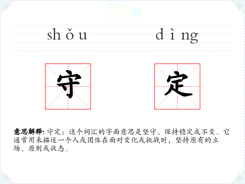 守定:这个词汇的字面意思是坚守、保持稳定或不变。它通常用来描述一个人或团体在面对变化或挑战时,坚持原有的立场、原则或状态。