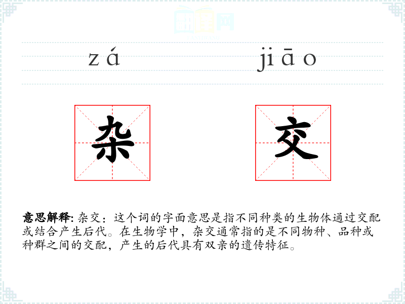 杂交:这个词的字面意思是指不同种类的生物体通过交配或结合产生后代。在生物学中,杂交通常指的是不同物种、品种或种群之间的交配,产生的后代具有双亲的遗传特征。
