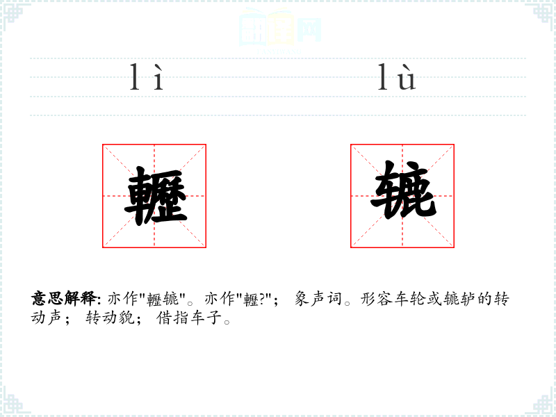 亦作"轣辘"。亦作"轣?"; 象声词。形容车轮或辘轳的转动声; 转动貌; 借指车子。
