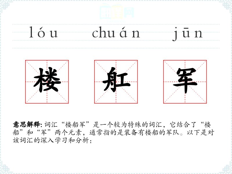 词汇“楼船军”是一个较为特殊的词汇,它结合了“楼船”和“军”两个元素,通常指的是装备有楼船的军队。以下是对该词汇的深入学*和分析: