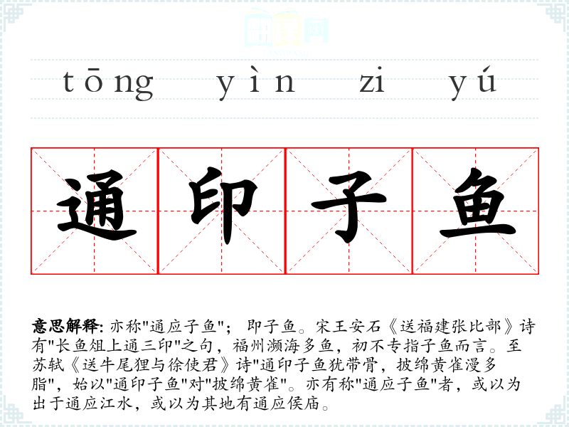 亦称"通应子鱼"; 即子鱼。宋王安石《送福建张比部》诗有"长鱼俎上通三印"之句,福州濒海多鱼,初不专指子鱼而言。至苏轼《送牛尾狸与徐使君》诗"通印子鱼犹带骨,披绵黄雀漫多脂",始以"通印子鱼"对"披绵黄雀"。亦有称"通应子鱼"者,或以为出于通应江水,或以为其地有通应侯庙。