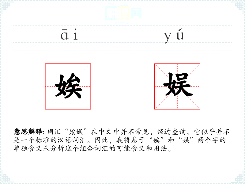 词汇“娭娱”在中文中并不常见,经过查询,它似乎并不是一个标准的汉语词汇。因此,我将基于“娭”和“娱”两个字的单独含义来分析这个组合词汇的可能含义和用法。