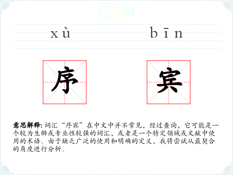 词汇“序宾”在中文中并不常见,经过查询,它可能是一个较为生僻或专业性较强的词汇,或者是一个特定领域或文献中使用的术语。由于缺乏广泛的使用和明确的定义,我将尝试从最契合的角度进行分析。