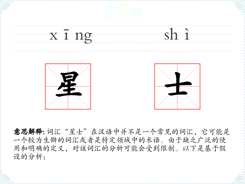 “星士”字面意思可能是指与星星有关的人或职业,比如天文学家、占星师等。它可能是一个复合词,由“星”(星星)和“士”(人或专业人士)组成。