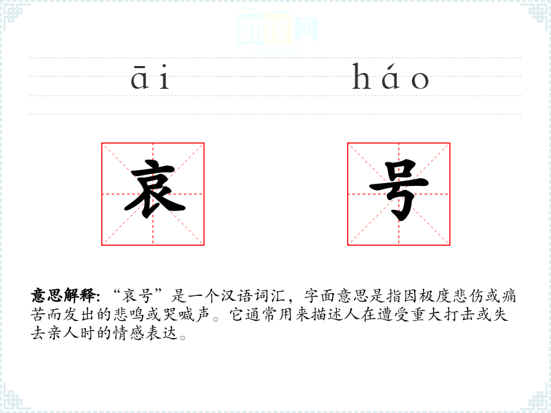 “哀号”是一个汉语词汇,字面意思是指因极度悲伤或痛苦而发出的悲鸣或哭喊声。它通常用来描述人在遭受重大打击或失去亲人时的情感表达。