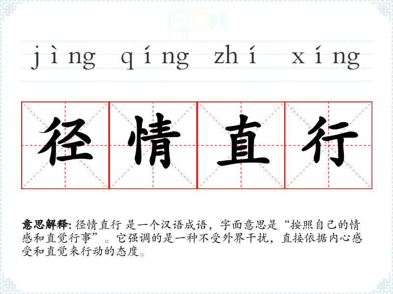 径情直行 是一个汉语成语,字面意思是“按照自己的情感和直觉行事”。它强调的是一种不受外界干扰,直接依据内心感受和直觉来行动的态度。